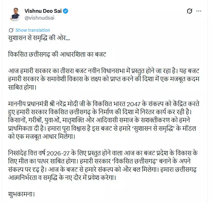 रायपुर। मुख्यमंत्री विष्णु देव साय ने वित्त वर्ष 2026-27 के लिए प्रस्तुत होने जा रहे छत्तीसगढ़ के बजट को प्रदेश