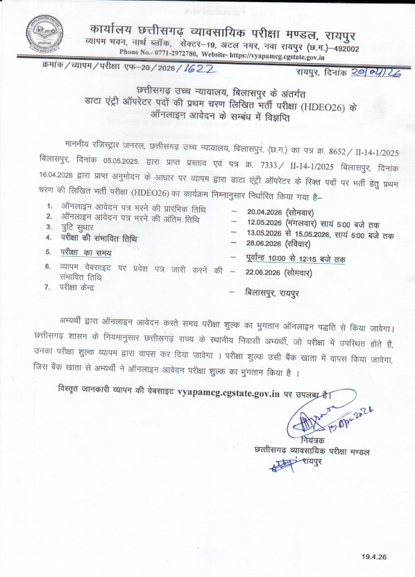 CG Vyapam Recruitment 2026: छत्तीसगढ़ के युवाओं के लिए सरकारी नौकरी पाने का शानदार अवसर सामने आया है। छत्तीसगढ़ व्यावसायिक परीक्षा मंडल ने वर्ष 2026 के लिए Data Entry Operator भर्ती प्रक्रिया शुरू कर दी है। इस भर्ती के माध्यम से छत्तीसगढ़ हाई कोर्ट में कुल 38 रिक्त पदों को भरा जाएगा। लंबे समय से सरकारी नौकरी की तैयारी कर रहे उम्मीदवारों के लिए यह एक बेहतरीन मौका माना जा रहा है।