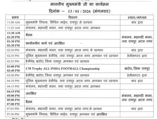 दोपहर 1.30 बजे से 2.30 बजे तक मुख्यमंत्री विष्णुदेव साय मंत्रालय में ही कार्यालयीन कार्यों में व्यस्त रहेंगे। इसके बाद 2.35 बजे वे रायपुर जिले के खरोरा के लिए रवाना होंगे। खरोरा में शाम 3 बजे आयोजित सीएम ट्रॉफी ऑल इंडिया फुटबॉल चैंपियनशिप कार्यक्रम में मुख्यमंत्री मुख्य अतिथि के रूप में शामिल होंगे। इस आयोजन से प्रदेश में खेल संस्कृति को बढ़ावा देने और युवाओं को प्रोत्साहित करने का संदेश दिया जाएगा।