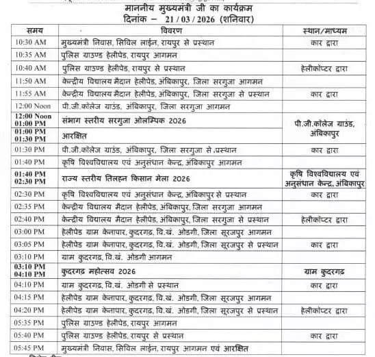 दिनभर के कार्यक्रमों के बाद मुख्यमंत्री शाम 5:35 बजे रायपुर लौटेंगे। कुल मिलाकर, सरगुजा ओलंपिक 2026 और अन्य आयोजनों के जरिए क्षेत्र में खेल, कृषि और विकास को नई गति मिलने की उम्मीद है।