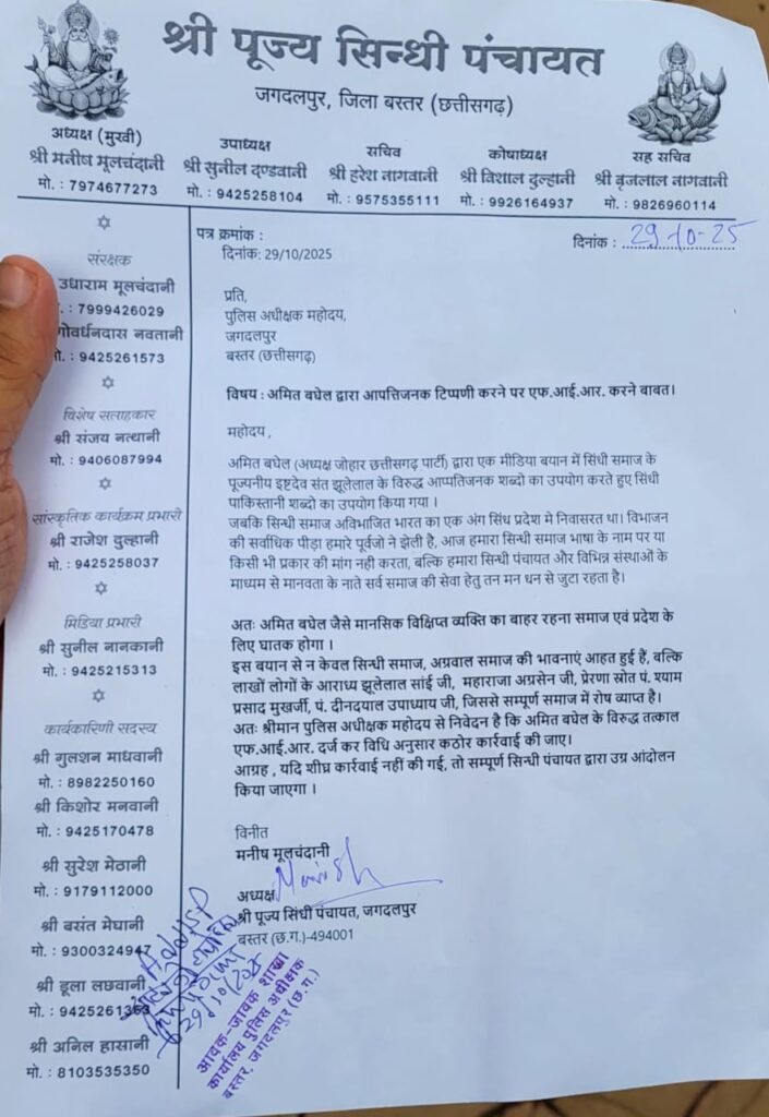 जगदलपुर – हमारे छत्तीसगढ़ में जहां नक्सलीयों की दहशत थी उसे केंद्र सरकार व राज्य सरकार ने मिलकर कुचल दिया, अब ऐसे में शांत प्रदेश में अचानक सामाजिक उन्माद फैलाने वाले रायपुर के अमित बघेल जातिवाद व सनातनी विरोध कर रहा. सिंधियों को पाकिस्तानी कह रहा, अरे उसे जानकारी ही नहीं सिन्धी समाज अखण्ड भारत के निवासी रहे, अमित बघेल सिन्धी समाज के इष्टदेव झूलेलाल जी, अग्रसेन महाराज जी, प. दीनदयाल जी के बारे में अमर्यादित बयानबाजी कर रहा हैं जिसका पूज्य सिन्धी पंचायत के समस्त पदाधिकारी व समाज सदस्य अपने गुरुद्वारा में मिलकर कर पैदल चल कर कोतवाली चौक से होते हुवे पुलिस अधीक्षक कार्यालय पहुँच कर अतिरिक्त पुलिस अधीक्षक माहेश्वर नाग जी को अमृत बघेल रायपुर के खिलाफ FIR करने का आवेदन दिया.**सिन्धी समाज के अध्यक्ष मनीष मूलचंदानी समस्त पदाधिकारी व समाज सदस्यों ने इस क्रांतिकारी सेना के अमित बघेल के द्वारा अलग अलग समाजो और उनके महापुरुषों संतो पर की गई टिप्पणी पर ए एस पी महेश्वर जी से कहा अमित बघेल पर जल्द कार्यवाही करें ताकि ऐसे धार्मिक भावनाएं आहत करने का दुशसाहस कोई न करें. इस अमित पर धार्मिक उन्माद फैलाने वाली धारा लगाकर कार्यवाही हो. इस महत्वपूर्ण प्रक्रिया में सर्व हिन्दु समाज संगठन के पदाधिकारीगण व सदस्यों की उपस्थिति के साथ सिन्धी समाज के युवाओं ने अमित बघेल मुर्दाबाद, हाय हाय कहा.**सिन्धी समाज के इष्टदेव झूलेलाल के बारे अभद्र टिप्पणी पर अमित बघेल के खिलाफ fir करने के लिए उधाराम मूलचंदानी, सुंदर भोजवानी, सुनील दंडवानी, हरेश नागवानी, विशाल दूल्हानी, शंकर नानकानी, संतोष बजाज, गुलशन माधवानी, राजेश दूल्हानी, अनिल हासानी, बसंत मेघानी, डुला लछवानी, कैलाश दंडवानी, विजय बसन्तवानी, रविंद्र हेमनानी, मनोज मूलचंदानी, मनीष दूल्हानी, गोपाल तीर्थानी, सन्नी बजाज, राज केवलानी, निखिल कलवानी, विनोद मूलचंदानी, भीखम दूल्हानी, मयंक नत्थानी, मयंक मेठानी, रितेश दूल्हानी, गौरव लालवानी, रोहित हासानी, मनोज माधवानी, अमित गोविंदानी, सुनील नत्थानी, सहित रंजीत पांडे, राम नरेश पांडे, कौशिक शुक्ला पुलिस अधीक्षक कार्यालय पहुँच कर fir दर्ज करने का आवेदन दिया.*
