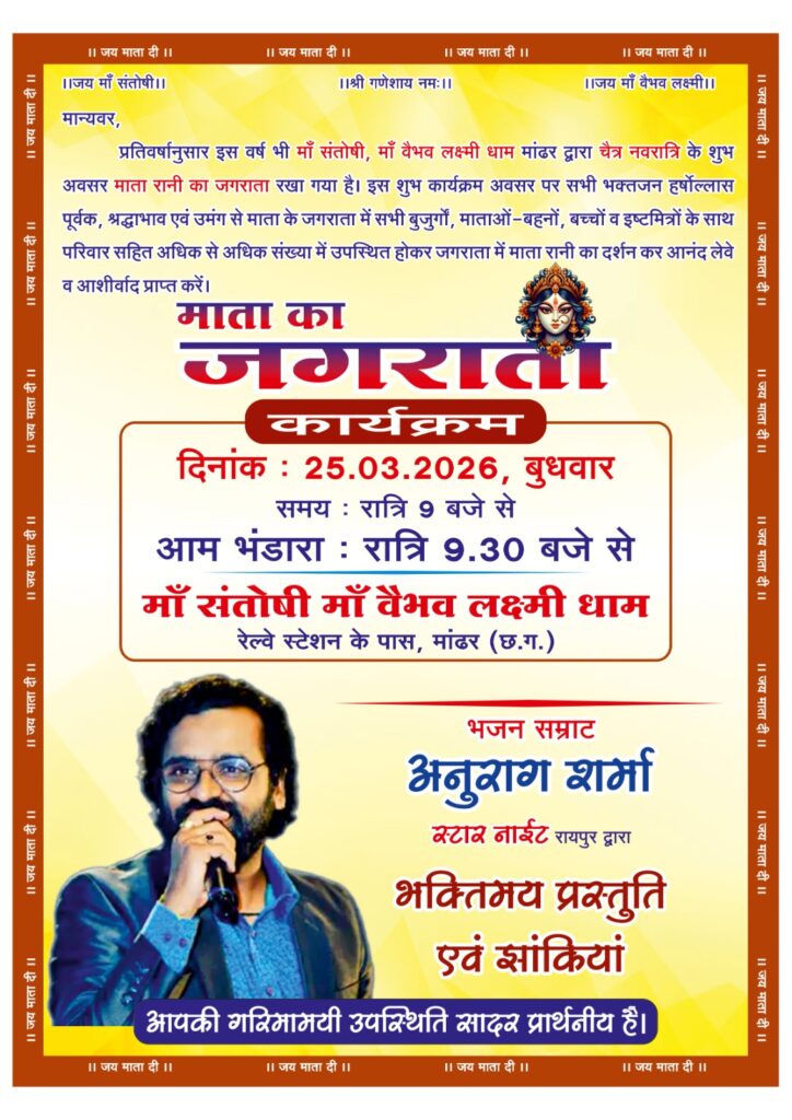 आयोजन स्थल: जय मां संतोषी जय मां वैभव लक्ष्मी धाम, रेलवे स्टेशन के पास, मांढर।