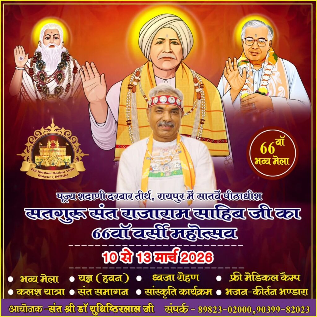 अंतर्राष्ट्रीय मानवता की सेवा के केंद्र तथा भारतीय सनातन संस्कृति व सभ्यता के प्रतीक ख्याति प्राप्त 317 वर्ष प्राचीन आस्था व सेवा का केंद्र रायपुर स्थित पूज्य शदाणी दरबार तीर्थ में प्रकांड विद्वान, करुणा के सागर, विनम्रता की मूर्ति परम पूज्य सतगुरु संत राजाराम साहब जी का 66 वां वर्सी महोत्सव 10 से 13 मार्च 2026 को बड़ी ही धूमधाम के साथ सेवा वर्ष के रूप में मनाया जा रहा है। जिसमें देश ही नहीं विदेशों से भी अनेक श्रद्धालु इस पावन अवसर का लाभ लेने पहुंच रहे हैं ।लोक कल्याण को अपना कर्तव्य समझ कर करने वाले शिव अवतारी पावन कल्याणकारी संत परंपरा के वर्तमान पीठाधीश नवम् अवतार संत डॉक्टर युधिष्ठिर लाल जी, कर्मयोगी, करुणा व प्रेम तथा सरलता व सहिष्णुता की मूर्ति, मानव सेवा ही माधव सेवा को चरित्रार्थ करते हुए अंतरराष्ट्रीय स्तर पर सनातन का परचम लहरा रहे हैं, जिनके मार्गदर्शन एवं सानिध्य में यह अंतरराष्ट्रीय महोत्सव सेवा वर्ष के रूप में मनाया जा रहा है जिसमें वर्ष भर सेवा के विभिन्न कार्य किए जाते रहेंगे।