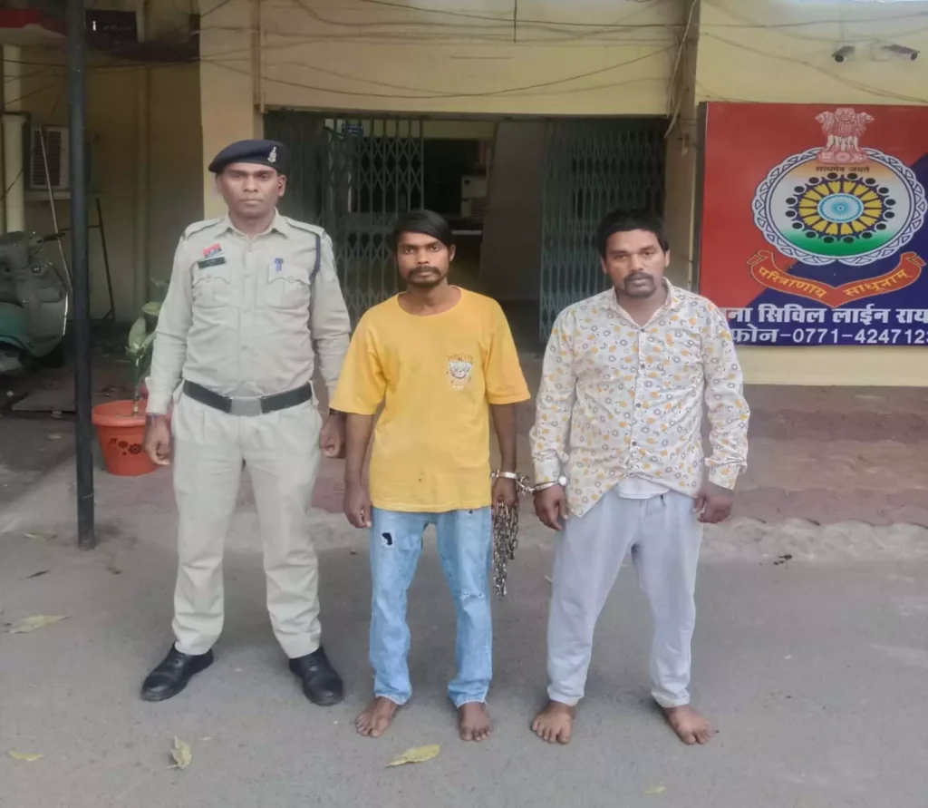 मुखबिर के बताए हुलिए के आधार पर पुलिस ने घेराबंदी कर दोनों संदिग्धों को पकड़ा। पूछताछ में उन्होंने अपना नाम दुर्गेश महानंद उर्फ फुला (30 वर्ष), निवासी गांधी नगर, थाना सिविल लाइन और शनि टंडन उर्फ हनी (22 वर्ष), निवासी सतनामी पारा, पुरैना तालाब पार, थाना न्यू राजेन्द्र नगर बताया।