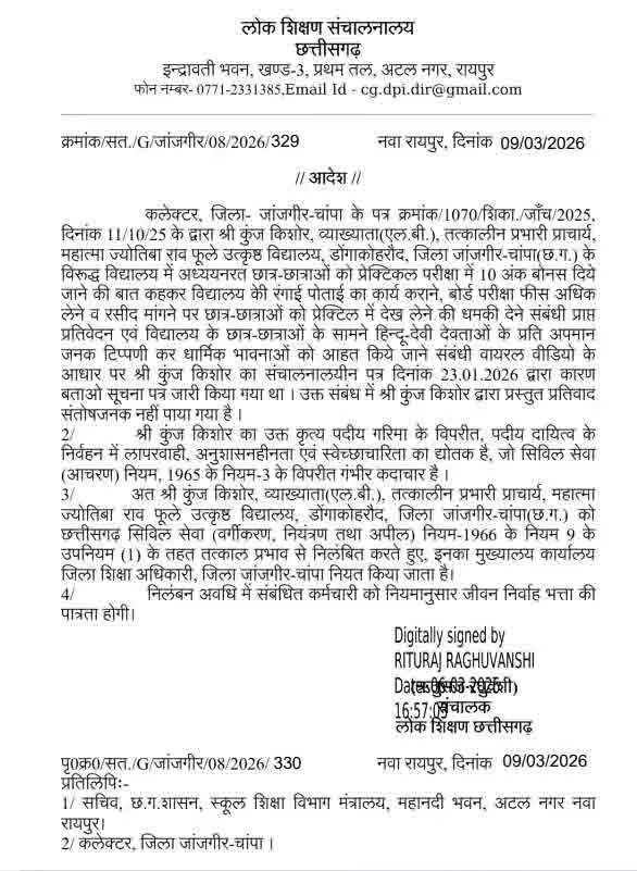 जांच में लगाए गए आरोपों की पुष्टि होने के बाद कुंज किशोर को कारण बताओ नोटिस जारी किया गया। हालांकि उनका जवाब संतोषजनक नहीं पाया गया। इसके बाद जिला शिक्षा अधिकारी ने निलंबन का प्रस्ताव डीपीआई को भेजा, जिस पर तुरंत कार्रवाई करते हुए Janjgir Principal Suspended आदेश जारी किया गया।
