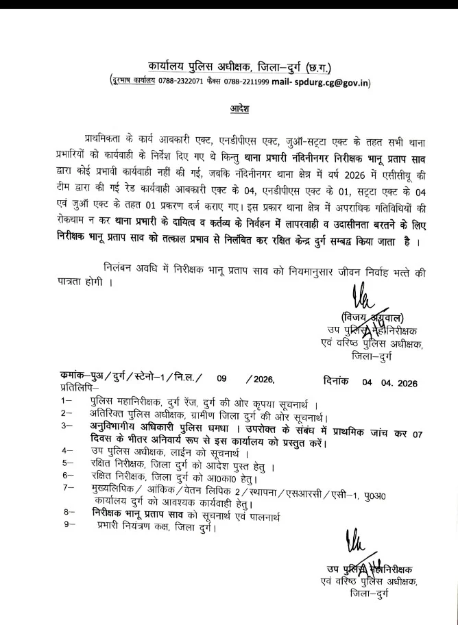 दुर्ग जिले में पुलिस विभाग ने बड़ा कदम उठाते हुए नंदिनी थाना प्रभारी निरीक्षक भानुप्रताप साव को निलंबित कर दिया है। यह कार्रवाई वरिष्ठ पुलिस अधीक्षक विजय अग्रवाल के निर्देश पर की गई है।