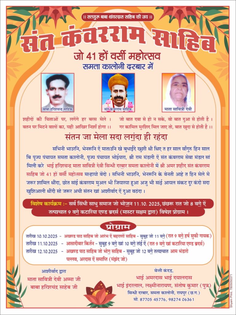रायपुर। प्रतिवर्षानुसार इस वर्ष भी संत कंवर राम साहब का 41वां बरसी महोत्सव बड़े हर्षोल्लास और श्रद्धा के साथ मनाया जाएगा। यह आयोजन समता कॉलोनी स्थित माता सावित्री देवी बाबा हरिश्चंद्र दरबार में 10, 11 और 12 अक्टूबर को संपन्न होगा। इस आयोजन की जानकारी भाई साहब अमरलाल एवं दरबार के सेवादार प्रेम प्रकाश मध्यानी ने दी।